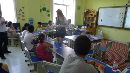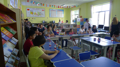 不一會兒,鈴聲響了,學(xué)生們走進(jìn)教室、挑選好座位圍成半圓,家長則被工作人員安排在教室后側(cè)的觀摩區(qū)內(nèi)。 “中加教育”委派的資深教育專家Feriel Parker女士, 開始與蘭州的學(xué)生和家長們零距離見面。由她先后主講的英語和法語兩堂特色課,無需翻譯輔助,通過淺顯生動的交流互動,孩子們對陌生的語言環(huán)境逐漸“打開心靈”、“張開嘴巴”,并慢慢融入其中。