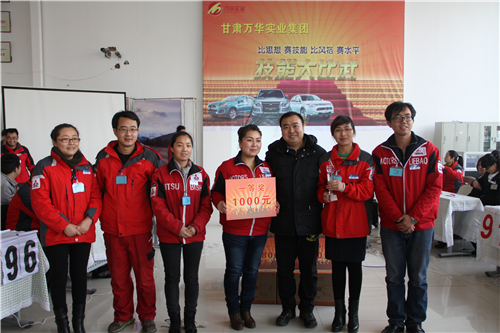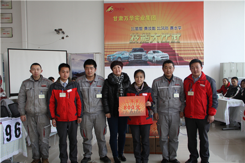 (董事會辦公室 盛玉卿)掌聲送給汽車公司一線崗位學習和戰(zhàn)斗著的同事們!2014年12月26日下午,由甘肅萬華汽車監(jiān)事會、萬華人資公司共同主辦的“2014年汽車公司‘技能大比武’”在甘肅萬華進口三菱展廳成功舉辦。6家汽車公司通過抽簽選出的36名參賽選手參加了此次比賽。經(jīng)過兩個半小時的激烈角逐,萬華金盛隊以團體163分的總成績大比分奪冠。而隨著現(xiàn)場個人參賽成績統(tǒng)計結(jié)果的揭曉,萬華金盛售后服務經(jīng)理李惠萍榮獲個人總分第一,使得萬華金盛毫無懸念地成為本屆“技能比武”中的大贏家。