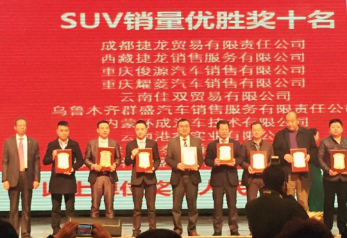 上午9時,會議正式開始,湖南獵豹廠家領導對汽車市場形勢、2015年營銷工作思路分析、講解,并重點針對2015年即將上市的新產(chǎn)品進行介紹。本次會議上,甘肅萬華金盛汽車銷售服務有限公司榮獲“獵豹SUV銷量優(yōu)勝獎” 并獲得廠家15萬元獎金獎勵,甘肅萬華汽車銷售有限公司執(zhí)行董事宿曉中代表萬華金盛上臺領獎。