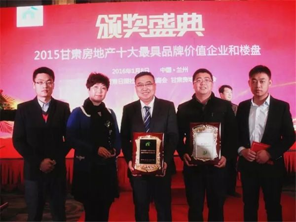 2016年1月8日,甘肅房地產(chǎn)業(yè)界年度盛事——“2015甘肅房地產(chǎn)十大最具品牌價(jià)值企業(yè)、樓盤”評(píng)選活動(dòng)頒獎(jiǎng)典禮在蘭州萬(wàn)達(dá)文華酒店成功舉辦。敦煌千年古城開(kāi)發(fā)有限公司同時(shí)攬得“2015甘肅房地產(chǎn)十大最具品牌價(jià)值企業(yè)”和“2015甘肅房地產(chǎn)十大最具品牌價(jià)值樓盤”兩項(xiàng)大獎(jiǎng)。