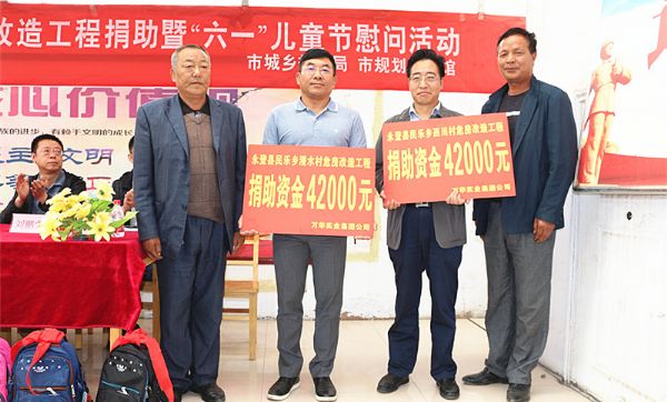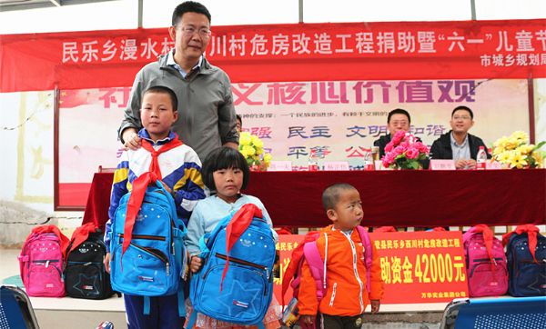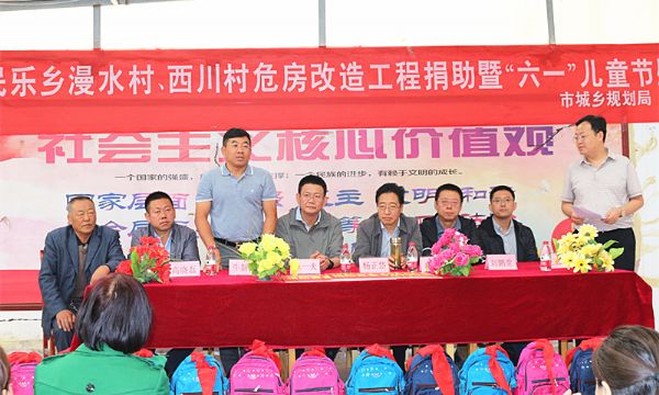 6月1日上午11時(shí)20分,民樂(lè)鄉(xiāng)漫水村、西川村危房改造工程捐助暨六一兒童節(jié)活動(dòng)在永登縣民樂(lè)鄉(xiāng)漫水村村委會(huì)如期舉行。甘肅萬(wàn)華實(shí)業(yè)集團(tuán)有限公司向漫水村、西川村各捐助4.2萬(wàn)元危房改造補(bǔ)助資金,蘭州市城鄉(xiāng)規(guī)劃局領(lǐng)導(dǎo)將嶄新的書(shū)包和學(xué)生用品送到當(dāng)?shù)睾⒆觽兪种�。蘭州市城鄉(xiāng)規(guī)劃局局長(zhǎng)陳一夫、黨組書(shū)記楊正岱,蘭州市城鄉(xiāng)規(guī)劃局黨組成員、副局長(zhǎng)盧健、楊正華、劉鵬堂,甘肅萬(wàn)華實(shí)業(yè)集團(tuán)有限公司董事長(zhǎng)牛新民、副總經(jīng)理宿曉中,民樂(lè)鄉(xiāng)漫水村黨支部書(shū)記張成海,民樂(lè)鄉(xiāng)西川村黨支部書(shū)記楊天海等領(lǐng)導(dǎo)出席活動(dòng)。