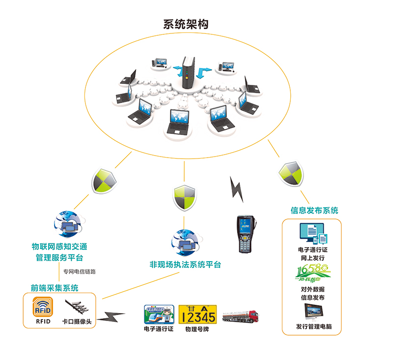 電子通行證系統(tǒng)利用先進(jìn)的RFID技術(shù)和視頻識(shí)別技術(shù)對(duì)貨運(yùn)車輛進(jìn)行全天候的自動(dòng)稽查、限行管理、并最終將違章記錄上傳給六合一系統(tǒng)(用戶權(quán)限管理、通行證系統(tǒng)管理、限行規(guī)則管理、通行證發(fā)放管理、監(jiān)控中心大屏以及統(tǒng)計(jì)查詢),極大的提高了對(duì)貨運(yùn)車輛的管控能力。