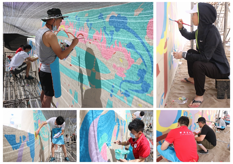 隨著絢麗多彩的巨型壁畫逐漸完工,一幅被腳手架和遮陽(yáng)布遮擋的藝術(shù)作品隱約躍入眼簾。大家不禁為西美研學(xué)團(tuán)堅(jiān)持不懈完成畫作的精神點(diǎn)贊,期待壁畫完工之時(shí),看到他們講述的千年敦煌之美。