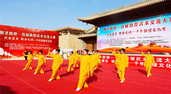 10月10日,朝圣敦煌——首屆敦煌武術交流大賽開幕式在千年敦煌·月牙泉小鎮(zhèn)民俗文化旅游景區(qū)盛大開幕。武術大賽在敦煌市委、市政府的大力支持下由甘肅省太極拳協會、太極網、未來傳媒、廣至傳媒、北京甘肅商會主辦,四方拍賣、敦煌千年古城文化發(fā)展有限公司承辦,千年敦煌·月牙泉小鎮(zhèn)民俗文化旅游景區(qū)、敦煌市武術協會、敦煌市太極拳協會、臨夏州太極拳協會、蘭州銀行敦煌分行、中國民營文化產業(yè)商會、中國收藏家協會、甘肅收藏家協會、蘭州市名匯秦川商貿有限公司、北京微海聯合電子商務有限公司、甘肅省臨洮縣豐盈綠洲種植專業(yè)合作社協辦。全國武術愛好者在充滿魅力的人文敦煌首次同臺競技。