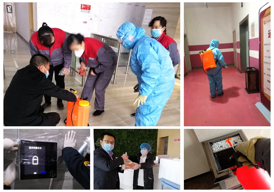 1月28日,防疫工作開始有條不紊地展開:工程部關(guān)閉大廈空調(diào)系統(tǒng),關(guān)停二維碼訪客系統(tǒng)和大廈貨梯以及負一、負二層客梯,有效地管控了人員出入;綜合部聯(lián)系印制防疫宣傳展架,禁止未佩戴口罩人員進入大廈,營造了嚴肅的防疫氛圍;客服部安排保潔每日對大廈所有衛(wèi)生間、垃圾桶、電梯、門把手及各樓層公共區(qū)域按時按要求進行消殺工作。