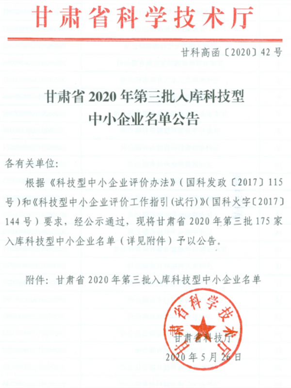 甘肅省2020年第三批入庫科技型中小企業(yè)共有175家,甘肅萬華金慧科技股份有限公司經(jīng)過企業(yè)自主評價、評價機構(gòu)審核等程序,通過認定,成功入選。甘肅萬華實業(yè)集團旗下已有兩家科技公司入庫。